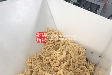 2017年5月12日,我公司客戶來我廠試機,在工廠現場,我們調試好了一套沙琪瑪流水線的設備供客戶觀看。沙琪瑪生產需經過這么幾個流程,第一,將油炸好的面粒倒進圓筒攪拌機攪拌;第二,攪拌好的物料裝進SMCF-650切塊機的入料口,自動完成整壓、冷卻、分條、分切這四道工序;第三,完成后的裸裝沙琪瑪經理料線整理成一列,緊接著進行分塊;第四,最后進入理料包裝機,便可完成自動包裝了。