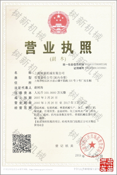 - 上海樹新機(jī)械有限公司于2007年正式于工商管理局注冊成立,并獲批一般納稅人資格, 2010年也順利注冊了商標(biāo):樹新機(jī)械.相關(guān)資質(zhì)證件如下...