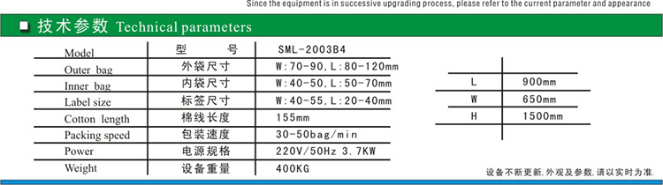 SML-200 machine is specially for packing tea bag, it can make inner bag, outer bag, tag, and cotton thread at the same time, do not need hand work with high automation and accurate measuring.