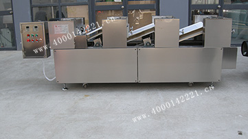 生產流程:1.和面 2.醒發 3.壓面 4.篩粉 5.油炸 6.熬糖三臺 7 .噴糖+攪拌 8.提升機 9.成型切割機 9.理料包裝機